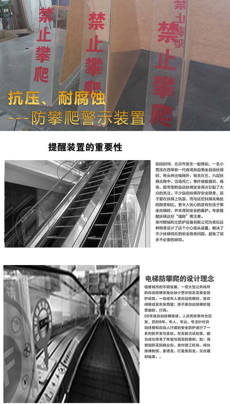 我司專業(yè)生產(chǎn)自動扶梯新國標(biāo)(防爬裝置禁止攀爬 小心碰頭 防碰防撞防裝置 防滑裝置 毛刷 扶梯中間防擋等) 防爬防滑行裝置扶手裝置應(yīng)沒有任何部位可供人員正常站立。如果存在人員跌落的風(fēng)險,應(yīng)采取適當(dāng)措施阻止人員爬上扶手裝置外側(cè)。